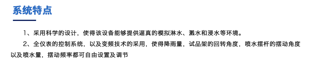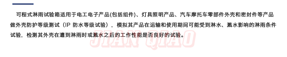 用途:可程式淋雨試驗箱適用于電工電子產品(包括組件)、燈具照明產品、汽車摩托車零部件外殼和密封件等產品做外殼防護等級測試(IP 防水等級試驗),模擬其產品在運輸和使用期間可能受